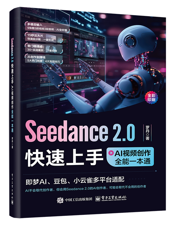 本书是一本系统讲解即梦AI及其最新Seedance2.0模型,指导读者创作视频的实战教程。全书共7章,循序渐进地引导读者从入门学习到商业变现。第1章讲解即梦AI的基础知识与Seedance2.0模型的核心功能;第2章讲解利用“一句话”生成视频的操作方法与常见问题的解决方案;第3章通过实例传授提示词的编写技巧;第4章深入讲解Seedance2.0模型的高级创作技巧;第5章讲解创作热门视频的方法;第6章讲解即梦AI与剪映的联动视频编辑流程;第7章讲解从AI内容创作走向商业变现的可行路径。即梦AI支持用户上传图片、视频、音频等多模态素材,在提示词引导下生成高质量视频内容。书中通过大量实例展示详细操作,并提供全案例视频教程与相关素材,帮助读者边学边练,高效掌握创作技能。本书适合AI工具的探索者、初学者及有一定经验的创作者,也可作为高校及相关培训机构的教材使用。