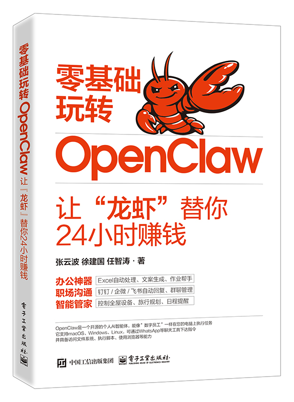 本书是一本写给普通人的AI自动化入门指南。全书用大白话讲清楚OpenClaw是什么、能帮你干什么,并通过大量真实场景案例,手把手教你用OpenClaw搞定那些烦人的重复工作——从整理表格、写小红书文案、自动发公众号,到盯钉钉消息、管QQ群,甚至控制全屋智能设备。全书分为四个部分:第一部分用3小时带你从零跑通第一个任务;第二部分聚焦办公场景,让你从此告别手动改数据;第三部分教你连上企业微信、钉钉、飞书,让它替你回消息;第四部分延伸至智能生活,从旅行规划到家庭事务提醒,让它帮你管好生活。书中所有案例都经过真实验证,并提供可直接套用的模板和避坑指南,确保你翻开就能用、用了就见效。