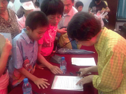 7月16日,曲老师来到大连市新华书店图书大厦六楼报告厅,在上下午先后举办了2场书法知识讲座。讲座离预定时间还有半小时开始,报告厅已经座无虚席。讲座开始后,曲老师深入浅出的讲解和紧密结合现实情况的书法知识应用举例,让在座的家长频频点头,孩子们也聚精会神的听讲,生怕错过一个知识点。讲座结束后,很多家长带着孩子的作业本,请曲老师现场指点。